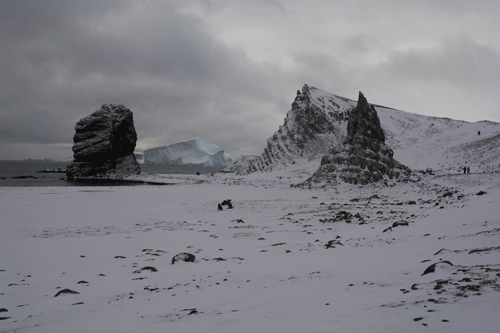 As lunch time approached we were nearly at the entrance to the English Strait, a channel between the islands of the South Shetlands. The ship therefore slowed to allow us to finish lunch before the dramatic entrance of the channel. The channel is bounded by several rocky islands and towers all made of the volcanic rock basalt. These islands are collectively known as Aicho Islands and we were heading to land on Barrientos Island. Aitcho takes its name from the British Admiralty’s Hydrographic Office (HO). After three days at sea we were all very glad to board the zodiacs and get off the ship. On the beach there were many penguins both chinstraps and gentoo penguins. There were also many whale bones, that had been recently un-earthed from the sands on the beach. It looked as if the recent storm had reorganised the beach completely; moving cobbles and digging into the sand. We landed at the eastern end of the island and in order to pass to the western si de of the island, we divided into groups and were guided around areas where sensitive mosses were growing. On the western side of the island were two very impressive columns of rock. These columns were clearly made from basalt and one had columnar cooling structures. On the beach James explained that these features have been interpreted by others as volcanic plugs, ‘the vents of volcanoes’. James however thought they may just be sea stacks formed from the erosive action of the sea even though the rock itself is indeed made from solidified lava flows. Also of interest on this western side of the island were more penguins, several Antarctic fur seals and a female elephant seal. There was also a huge tabular iceberg wedged near to the shore. It was explained how this iceberg would have had its origins further south on the Antarctic mainland and had probably calved off a floating ice shelf.