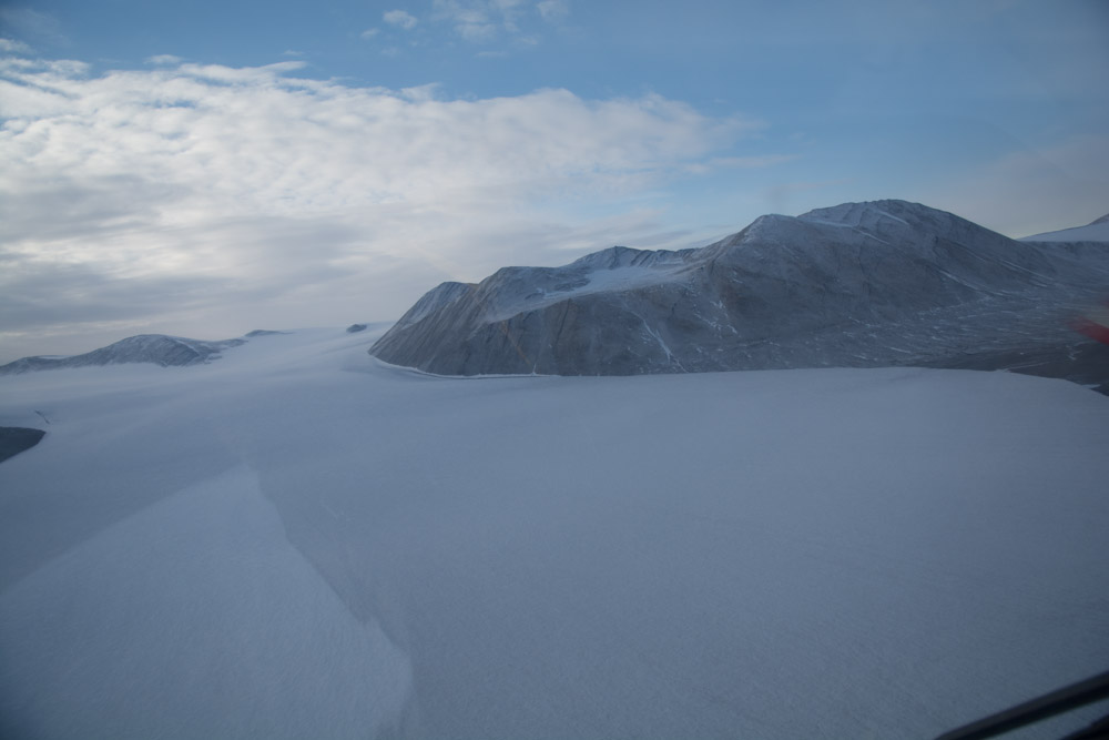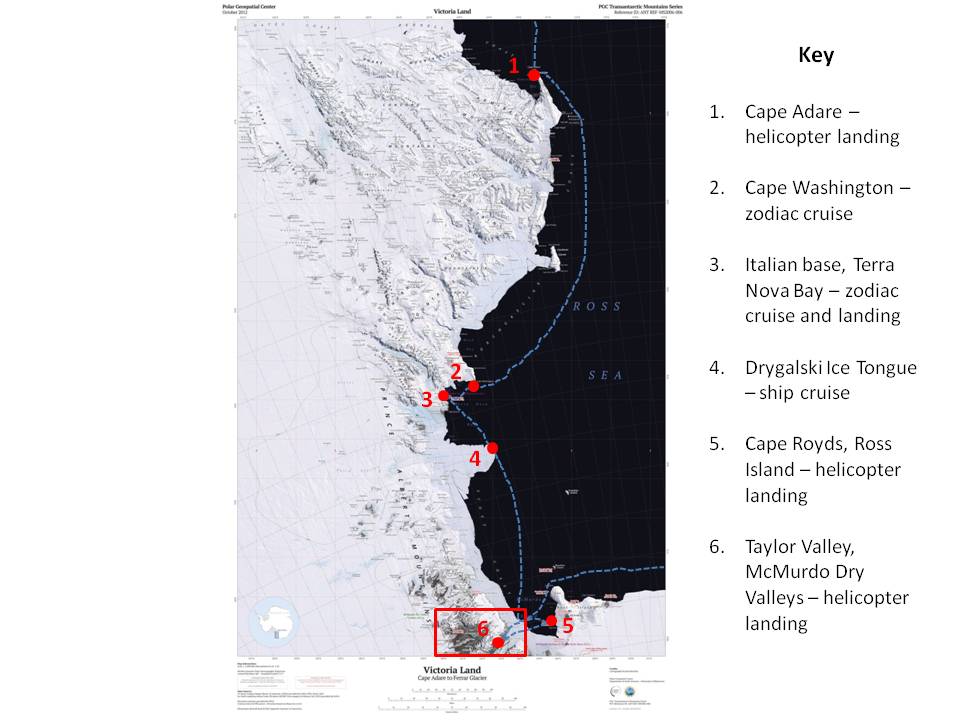 As the ship’s Geologist, I was lucky enough to be selected to fly in on the first helicopter to prepare the landing site for the passengers. It was an experience I will never forget. First we flew over ice floes and newly forming sea ice, with sleeping seals near to the shore line. Then we flew up over the land – dry land with no snow even though we were at nearly 78 degrees south. As we flew over the bare ground, I could see frost wedges caused by freezing and thawing of the permafrost. Then we saw the first glaciers: the Wales glacier coming in from the left and later the amazing piedmont of the Commonwealth glacier and our destination the Canada Glacier, coming in from the right.
