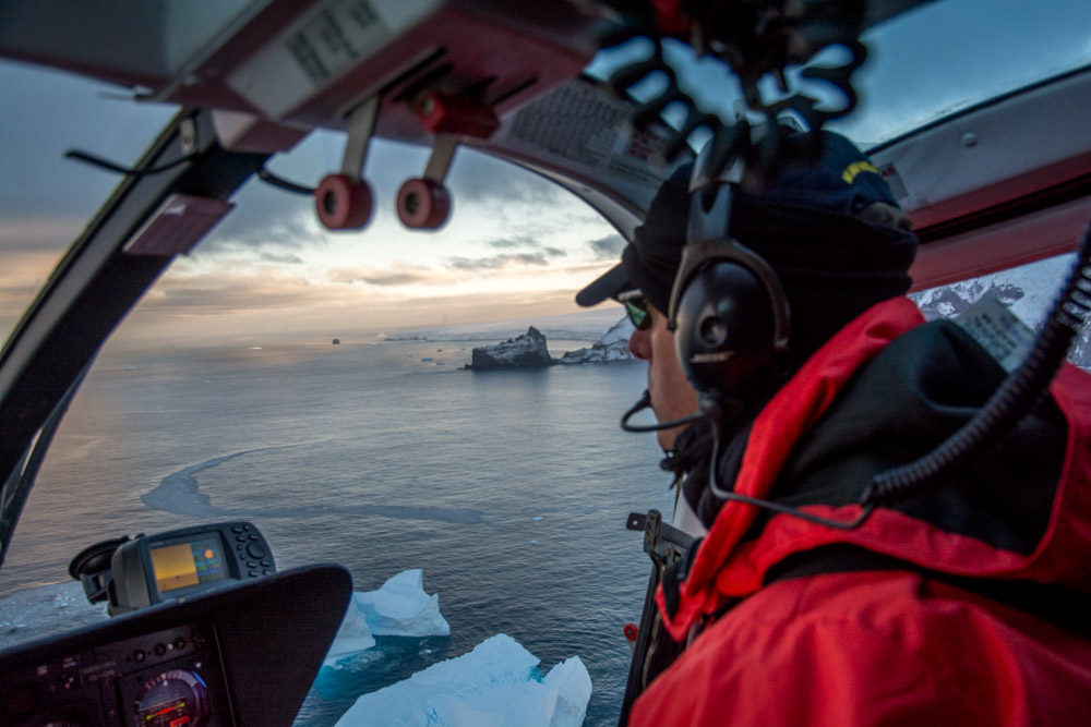 We waited and waited, then the cloud showed signs that it was lifting, however the wind was still 40 knots. Expedition Leader Don, and chief helicopter pilot Marcello decided they would do an exploratory flight into the Dry Valleys to see what the wind conditions were like up there. The pilot very skilfully lifted off the ship in the windy conditions and headed out across the ice towards the lifting cloud of the Dry Valleys.