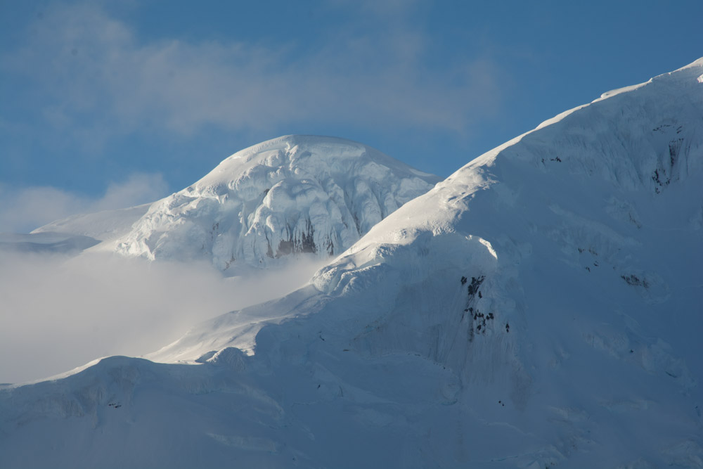 A photo of Mount Erebus, taken a few days ago. Mount Erebus is one of only 3 volcanoes in the world that has a permanent lava lake. It is also the world’s southern most historically active volcano. The phonolite lava contains unusually large crystals of anorthoclase feldspar, and is similar to lavas found on Mount Kenya and Mount Kilimanjaro in East Africa. The volcano is a polygeneric volcano, starting out life as a shield volcano. The rocky outcrop on its left flank is the remains of the previous crater to this shield volcano. The younger portions of the volcano are a strato-volcano built on top of the older shield volcano. Mount Erebus is located on Ross Island which is made up of 4 volcanoes in total: Mount Erebus, Mount Terror, Mount Terra Nova and Mount Bird. Ross Island is also home to the historic huts of Scott and Shackleton, and is home to the modern research bases of McMurdo an d Scott Base.