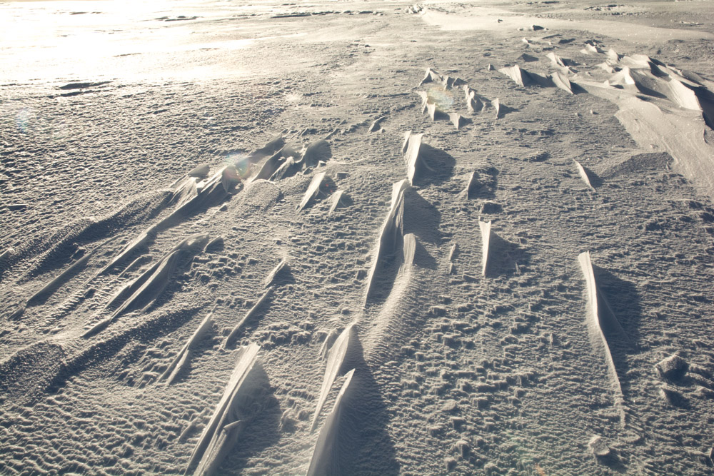 The Dry Valleys are free of ice because the Tran-Antarctic Mountains are so high. Ice from the East Antarctic Ice Sheet does not spill over into them to flow down these valleys. In addition to this the area is incredibly dry. There is very little snowfall and this snow cannot accumulate as a glacier. Any snow that does occur, often sublimes straight to water vapour or is blown out by the extreme catabatic winds that can rage down the valleys. As chance would have it there was some snow there on our visit day. The previous day’s storm had left a thin layer on the higher ground and on some of the boulders but it was quickly ablating away.