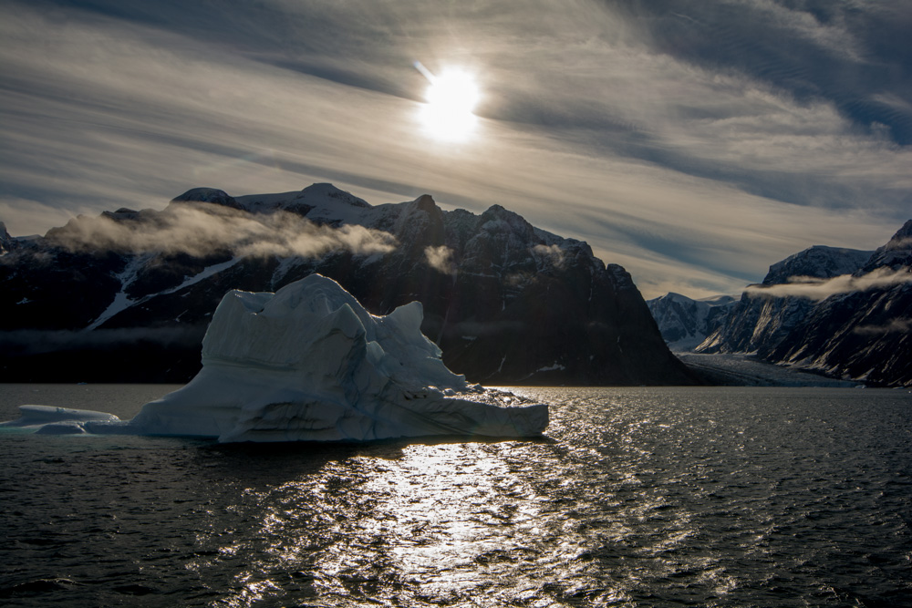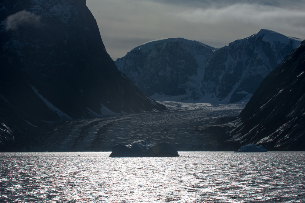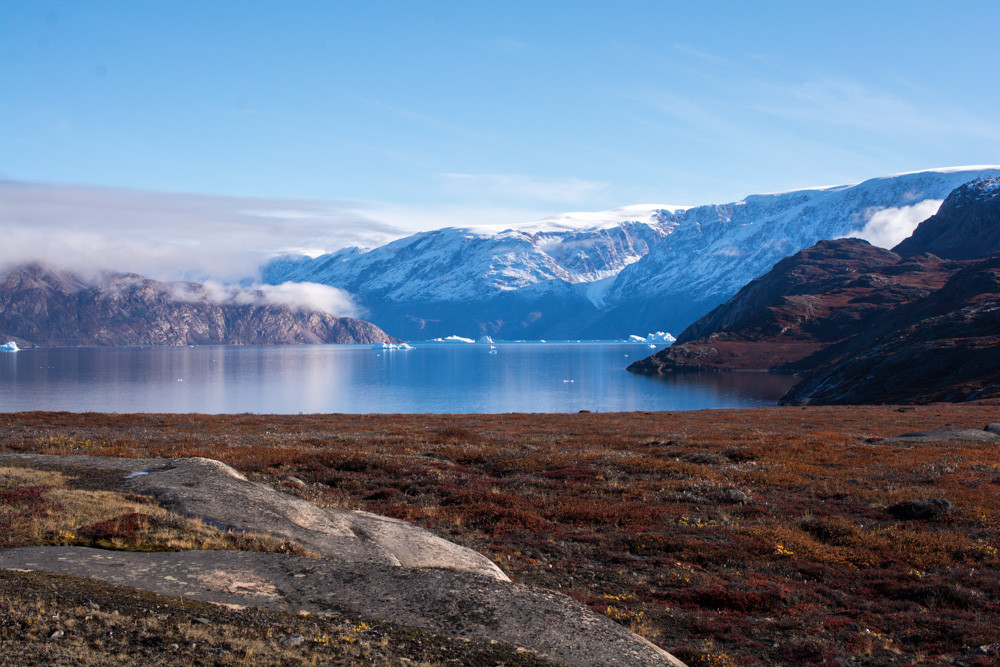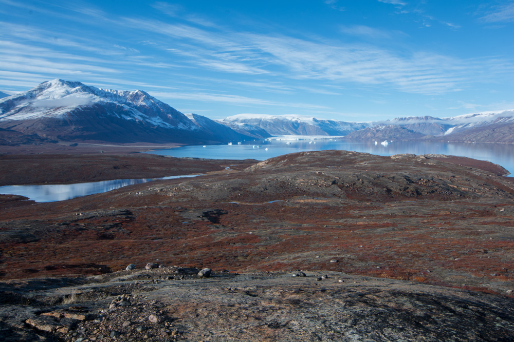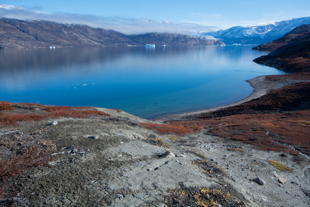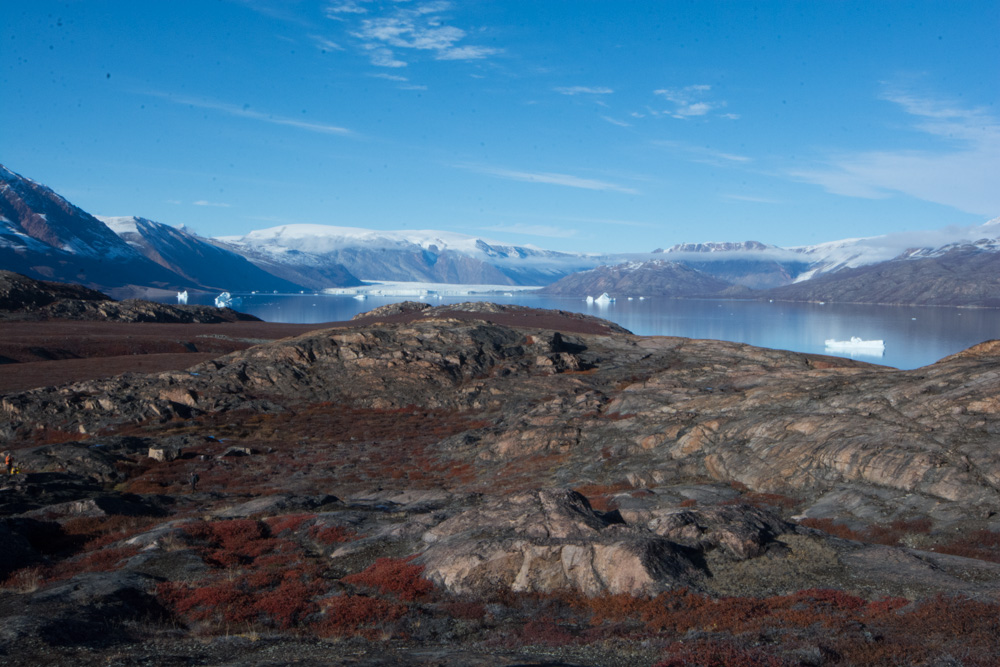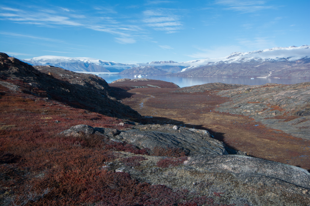 Øford is an amazing fjord packed with icebergs that cuts through 1 billion year old gneiss that has red bands of garnet crystals and is in places completely remelted into Augen granite.