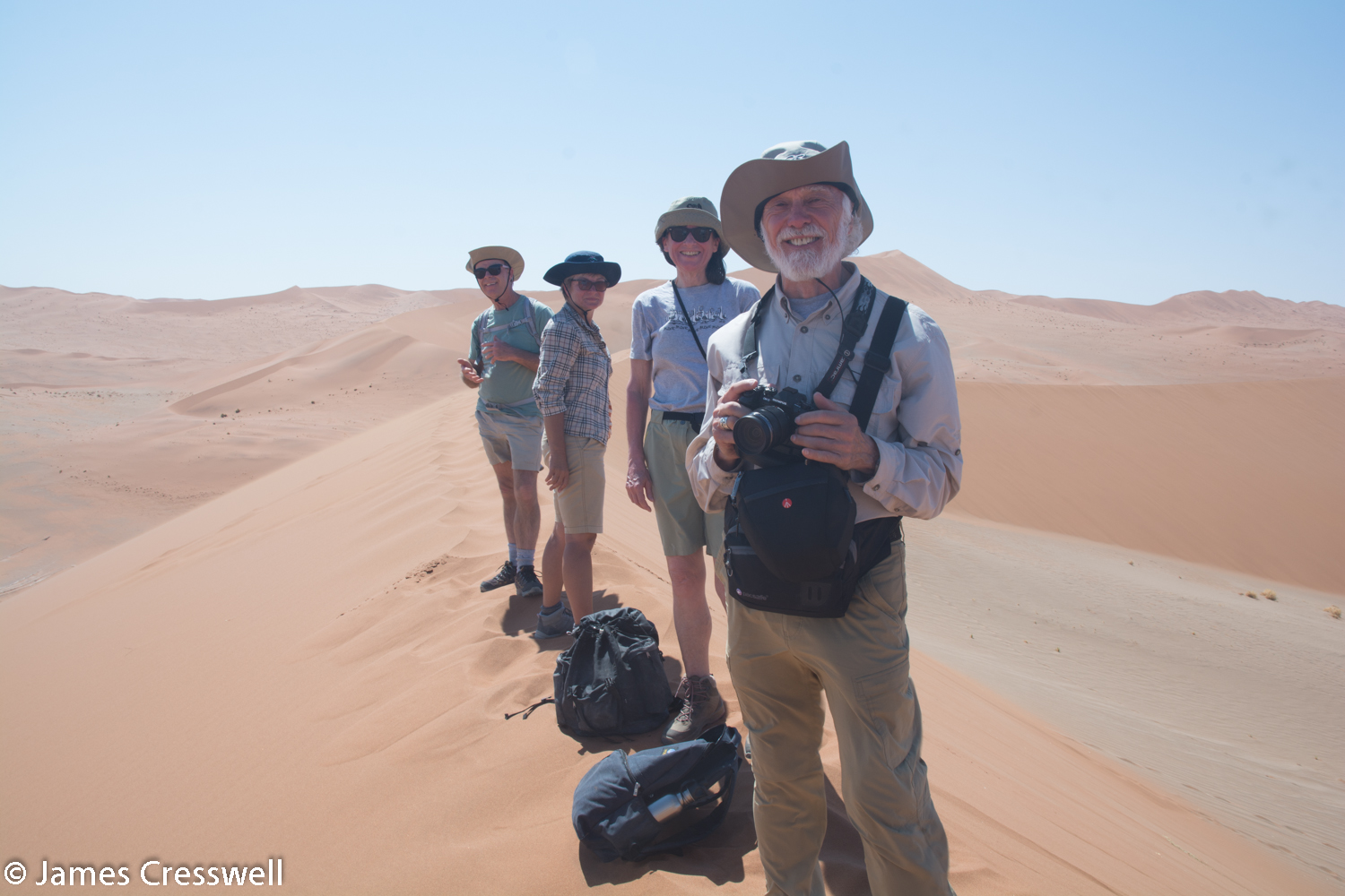 Today we visited of Namibia’s must-see natural wonders: the Sossusvlei sand dunes of the Namib Desert. At 225 m high, the dunes are amongst the highest in the world. The dunes are derived from material that eroded from the highlands of South Africa and Lesotho and was transported to the Namibian coast by rivers. This material was then blown onto the land in the Ice Age. The dunes have a red colour due to coating of haematite around the sand crystals. In some places the dunes have a beige covering; this is due to clay mineral from eroded local limestones.