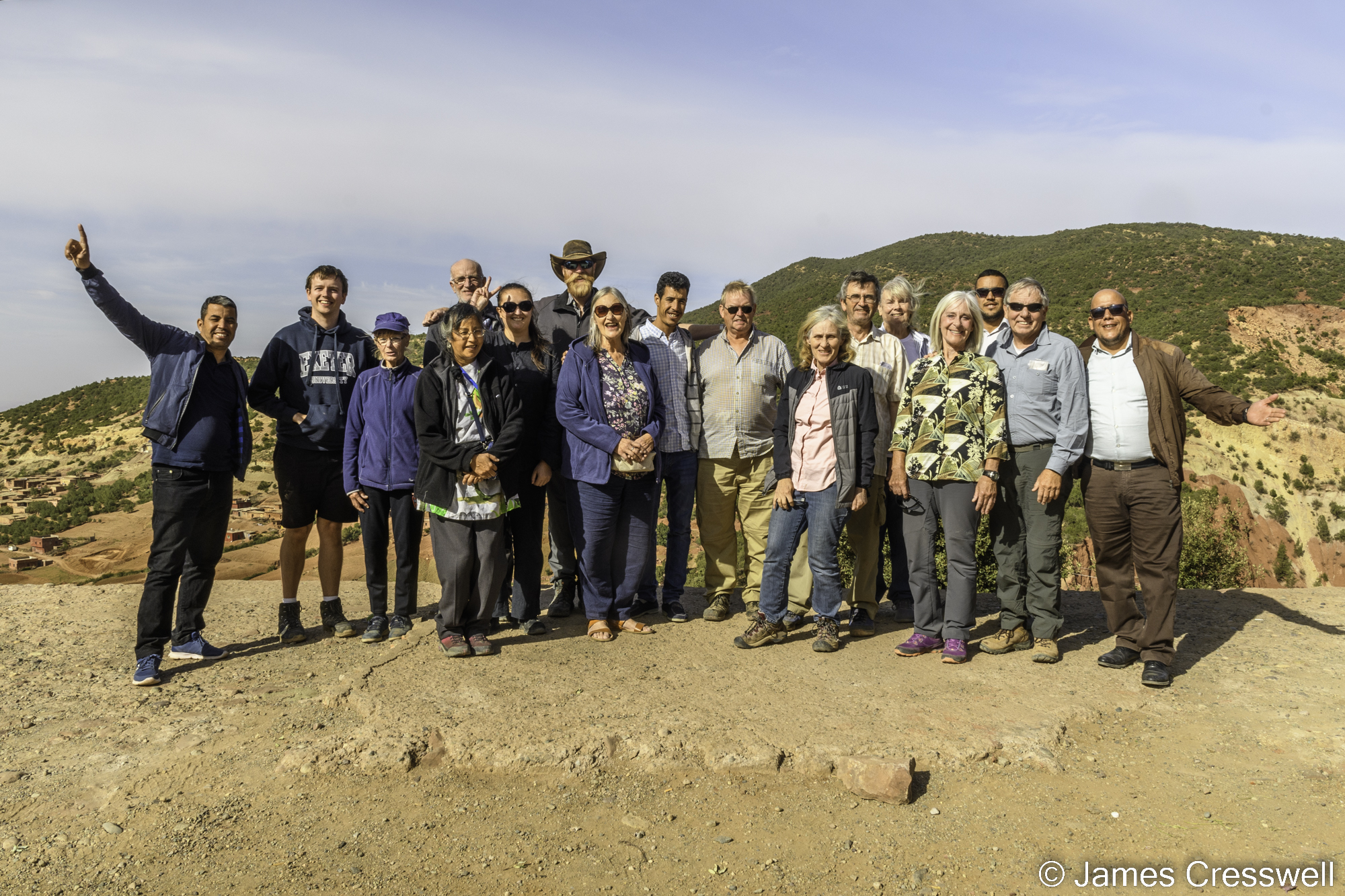 Our group of intrepid travellers, from the UK and the USA, all gathered in Marrakech for the start of the trip. The subsequent 10 days saw us travel across the country, traversing the Atlas mountains and spending time in the Sahara Desert before making the return journey to Morocco’s fourth largest city. Along the way, our group were lucky enough to visit many fossil discovery sites, including the Fezouata Shale Lagerstätte and the famous Kem Kem dinosaur beds. We saw many exquisitely prepared trilobites in the museum, in the shops and in the field. Equally impressive were the many examples of Orthoceras slabs which had been fashioned into various homewares and were on sale in Erfoud. As well as the many outstanding fossil sites, we also visited an agate quarry, a salt mine and a mineral mine, examining some of the superb mineral specimens which occur in Morocco. And if the wealth of fossils and minerals weren’t enough, we also spent time in the sand dunes of the Sahara Desert, we visited World Heritage Sites in Ait-Ben-Haddou and Marrakech, and we walked through the stunning Tohdra Gorge. We completed the trip having had a wonderful time examining the rich variety of Morocco’s geology and palaeontology, and spending time immersing ourselves in the culture of this enchanting and exhilarating country.