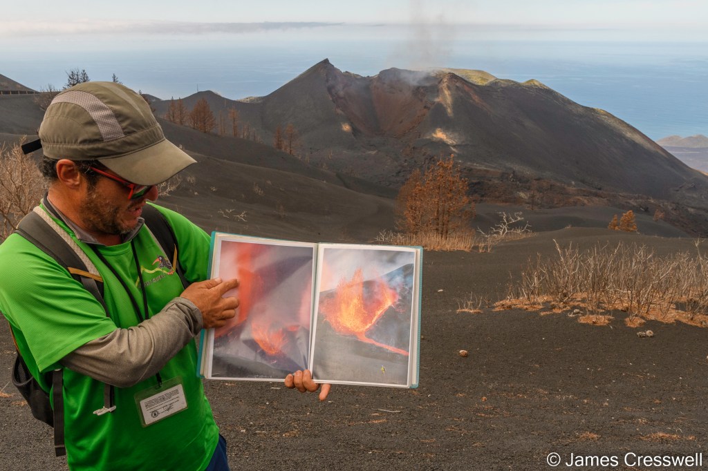 Above, from L-R: Our local guide, Romen, shows pictures of the 2021 Cumbre Vieja eruption that formed the new cone Tajogaite. He is standing in exactly the same place as where the pictures were taken.