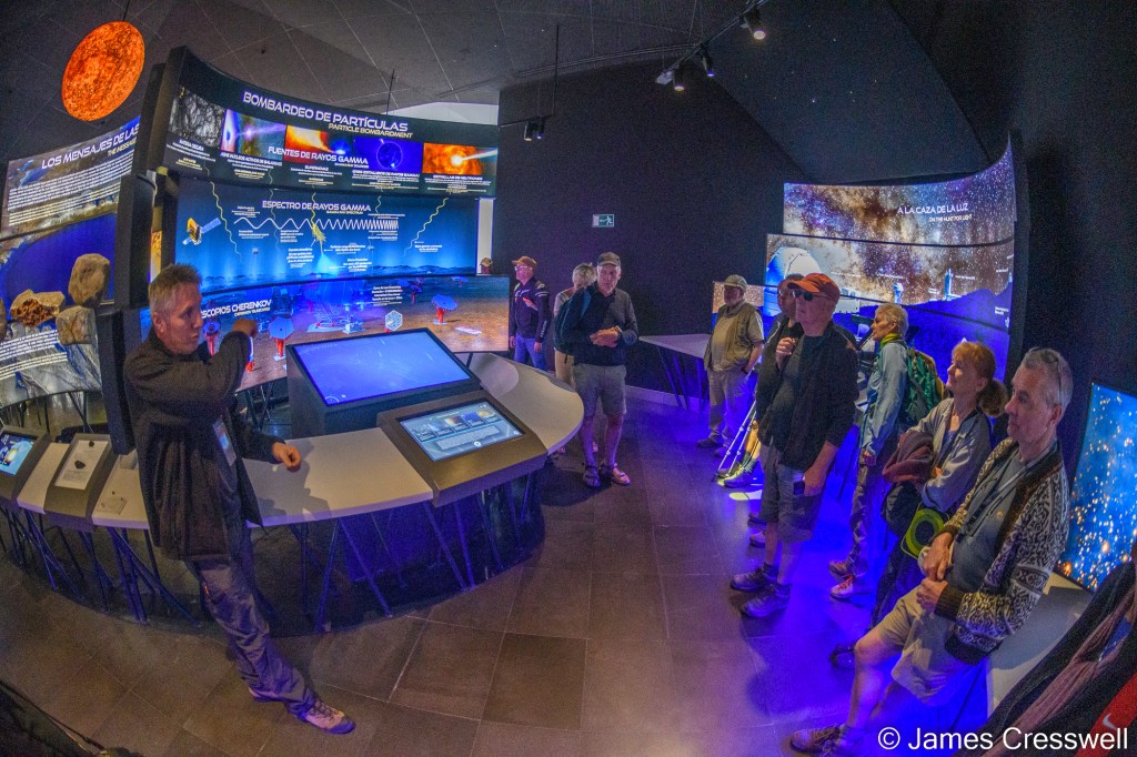 Above, from L-R: Our group being given a guided tour in the Roque de los Muchachos Visitor Centre, here we learnt all about La Palma’s telescopes and observatory.
