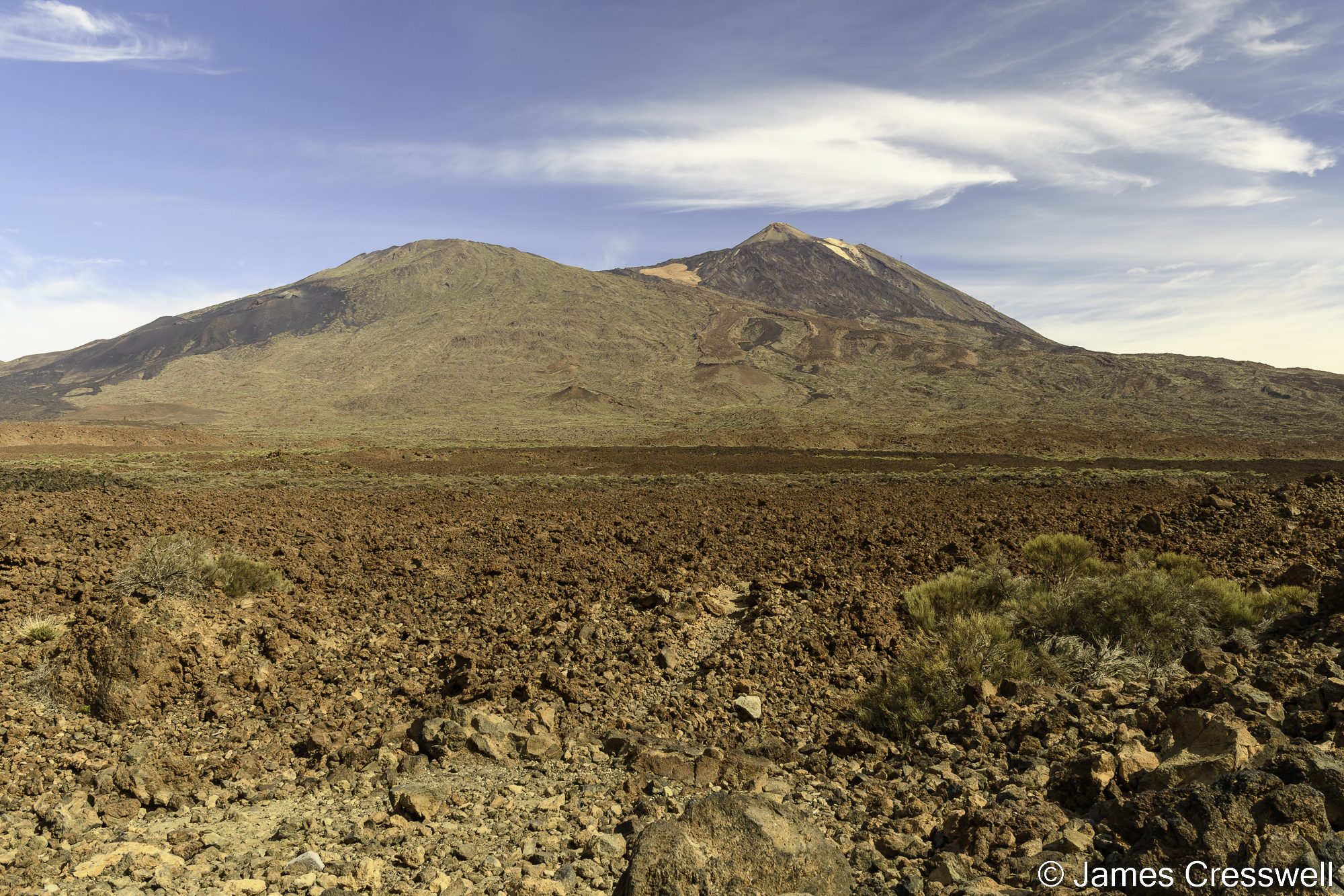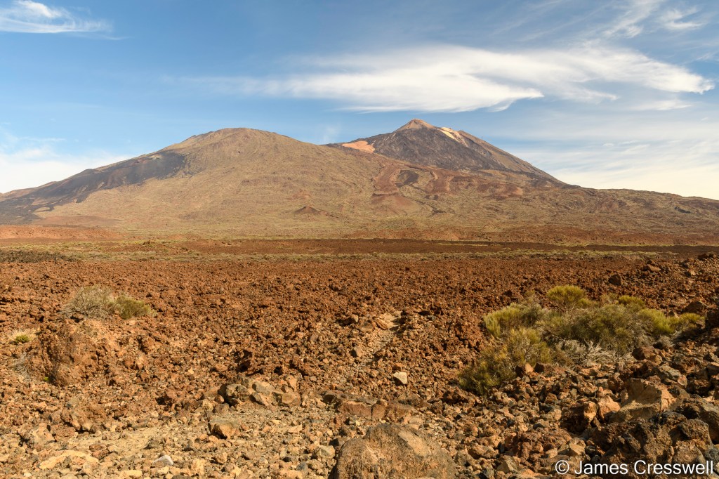 Above, from L-R: Mt Teide (3,715m) is the highest mountain in Spain and was once thought to be the highest mountain in the world. To the left of Teide is Pico Viejo volcano; rather than being a separate volcano it is in fact a parasitic cone of Teide. On Pico Viejo’s left flank, a fissure and associated lava flow can be seen. This was formed in the 1798 Chahorra eruption which emitted tephriphonolite.