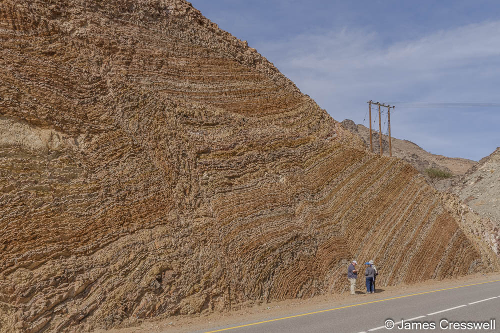 Above left: The GeoWorld Travel group with spectacular folds in the Hawasina Nappe. These sediments originated as turbidites on the ocean floor and were thrust over the Arabian continental foreland in a nappe during the emplacement of the Semail ophiolite. In the process the sedimentary layers became dramatically folded.