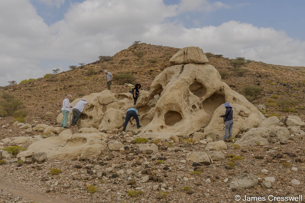 Bottom right: Our group standing in front of an outcrop of limestone which resembles a skull, due to wind erosion. This limestone is known as an Oman exotic, because it was once part of an atoll and contains many fossils.