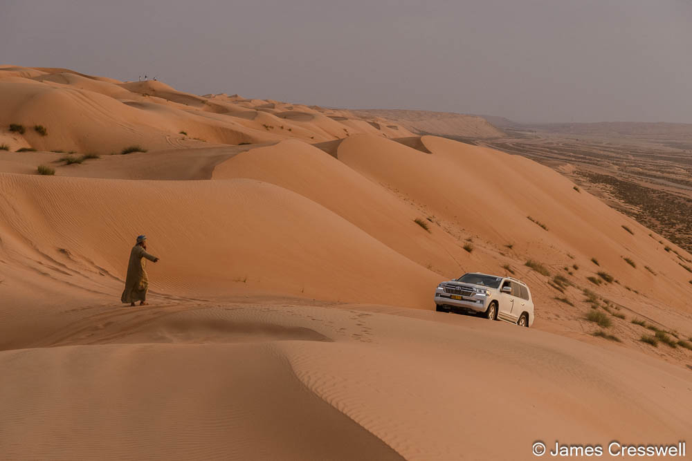 Top right: Driving up the Wahiba Sands (also known as Sharqiya Sands) dunes in preparation for sunset.