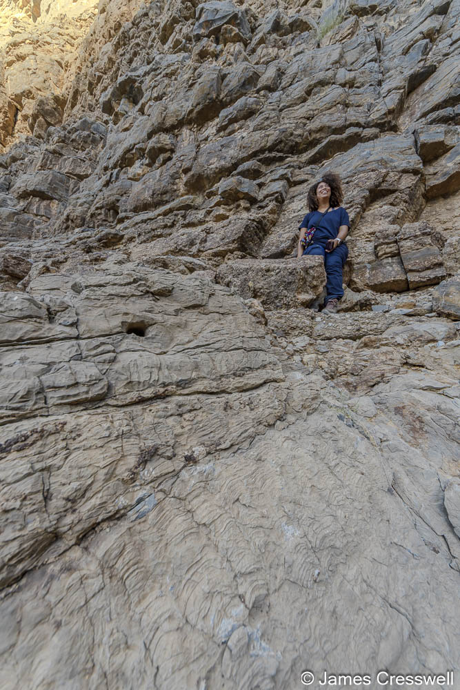 Above left: Camille sits on the same an angular unconformity shown in the previous photo. The Ediacaran aged rocks contain fossil stromatolites. The Permian deposits are beach deposits at their base changing up the cliff to continental shelf deposits.