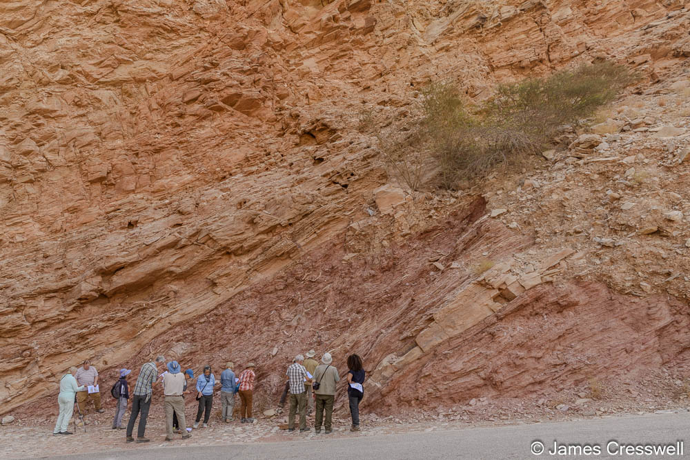 Above left: Our group at the “Mother of All Outcrops”. This beautiful rock sequence of interbedded red radiolarian chert and white porcellanite is folded and faulted. These sediments were deposited in an ocean maybe 4,000-5,000m deep and were emplaced with the Masirah Ophiolite some 15 to 20 million years after the emplacement of the more famous Semail Ophiolite.