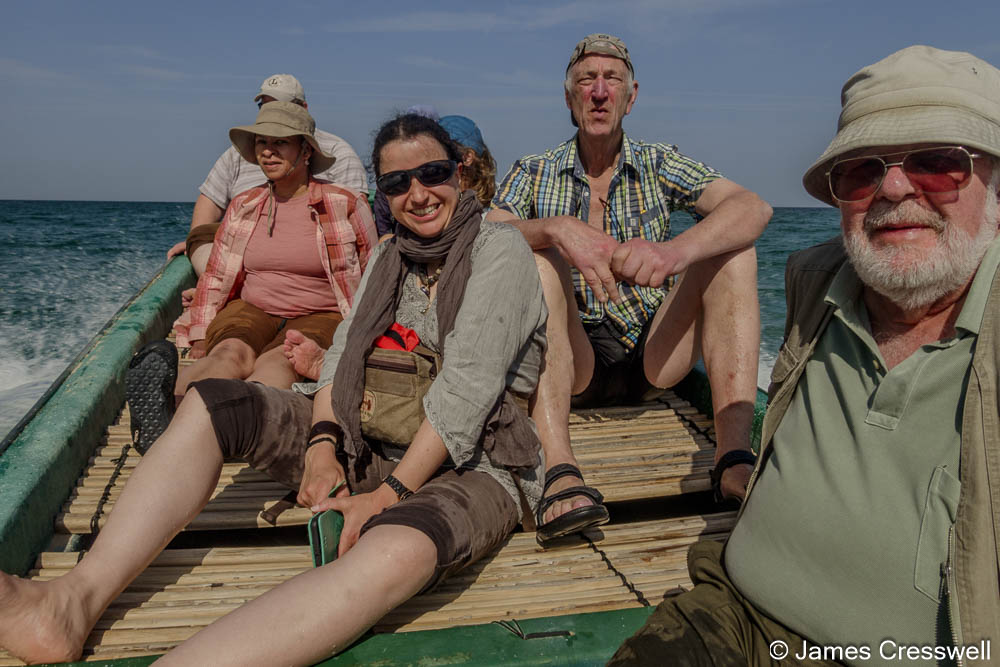 Bottom right: Allen, Sophie, Michelle, and Clarinus on a boat ride around a rocky headland to reach the As Sifah ecologite.