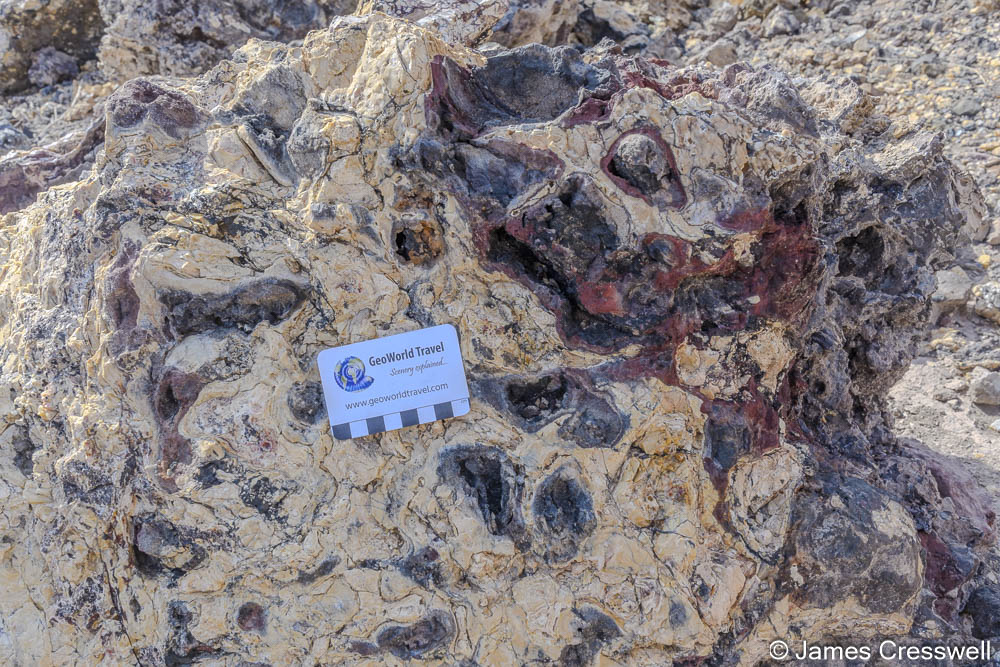 Above left: A fossilised black smoker that formed on the ocean floor, 90 million years ago, as part of the ophiolite complex. Black smokers exist at ocean spreading ridges where sea water passes through cracks in the ocean floor. When it gets near the mantle it’s super-heated and it can dissolve metal sulphides. As it returns to the surface and hits the cold water these metal sulphides precipitate out and form black smoke. It looks like smoke but it’s precipitation in the sea water. The hill is red because the basalt, and all the iron in it, has been oxidised.