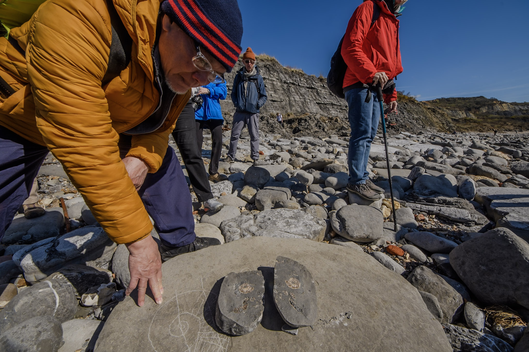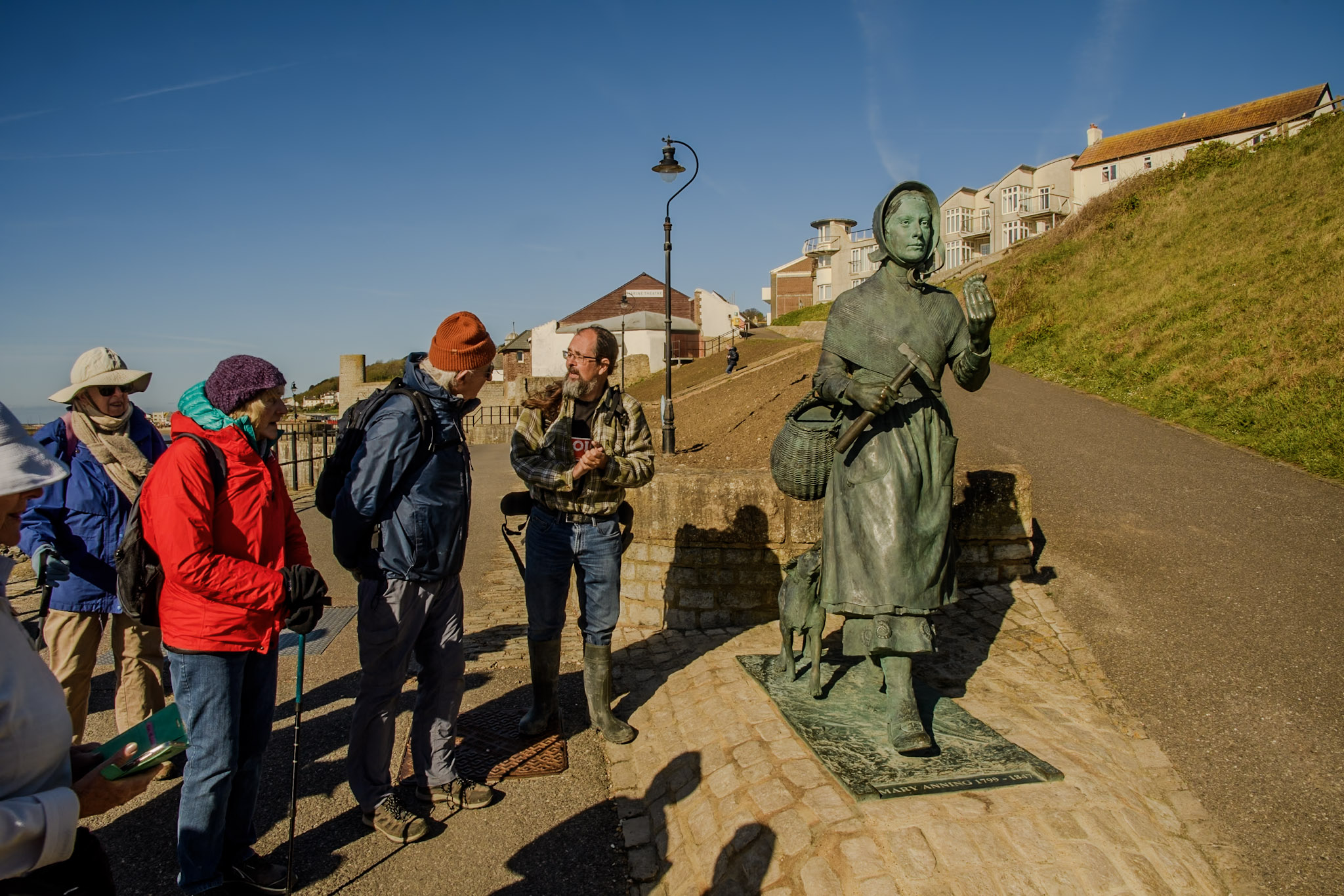 Above top right: Our local guide, Chris Andrew, gives our group an introduction to the fossils of Lyme Regis next to the relatively new statue of arguably the most famous fossil collector of all time, Mary Anning.