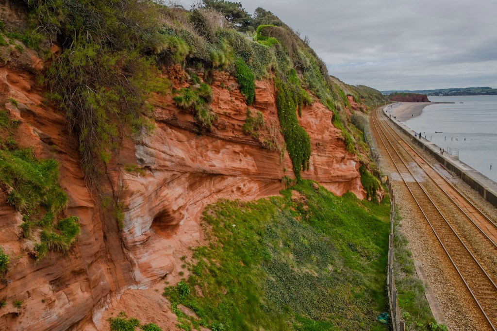 Top left: The sandstone cliffs at Dawlish, Devon. The cliffs are formed from aeolian (wind-blown) sand which was laid down in a desert in a continental interior in the Permian Period roughly 250 million years ago. The rocks are part of the New Red Sandstone.