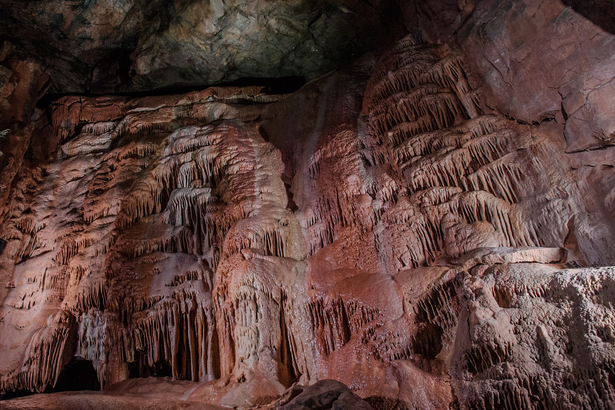 Top left: This photograph was taken inside Gough Cave, Cheddar Gorge. This is a beautiful flowstone where water has flowed down and precipitated out the calcium carbonate.