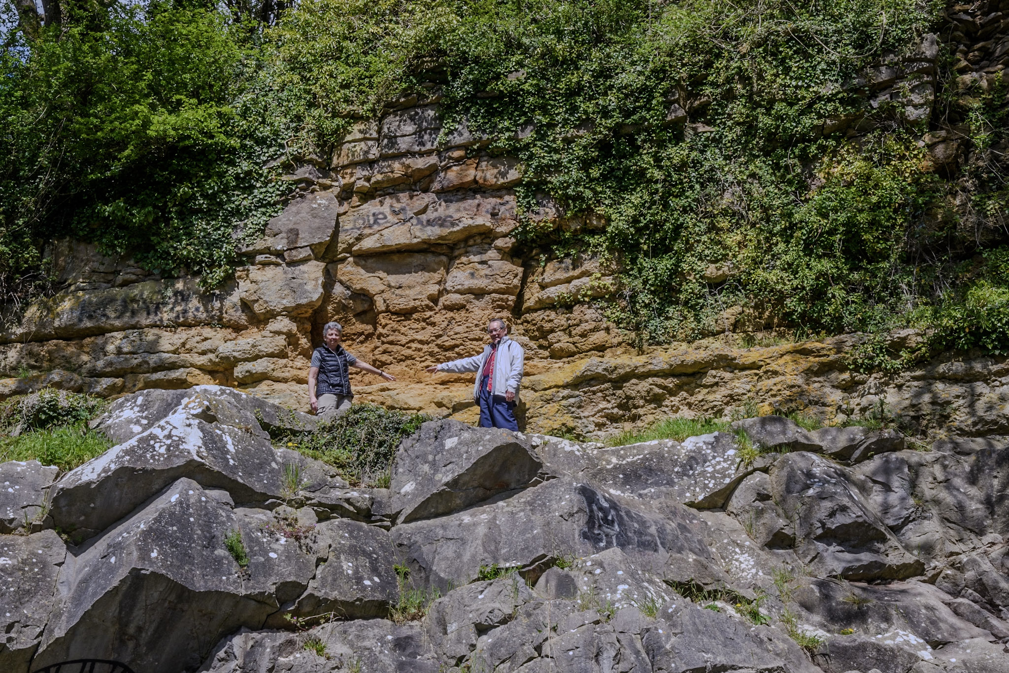 Middle right: Dave and Janine standing on the De La Beche unconformity in Vallis Vale. Here, in an old quarry the unconformity between the yellow-coloured, horizontally bedded Jurassic Inferior Oolite limestone and the underlying grey, massively bedded and steeply dipping Carboniferous Vallis Limestone can be seen.