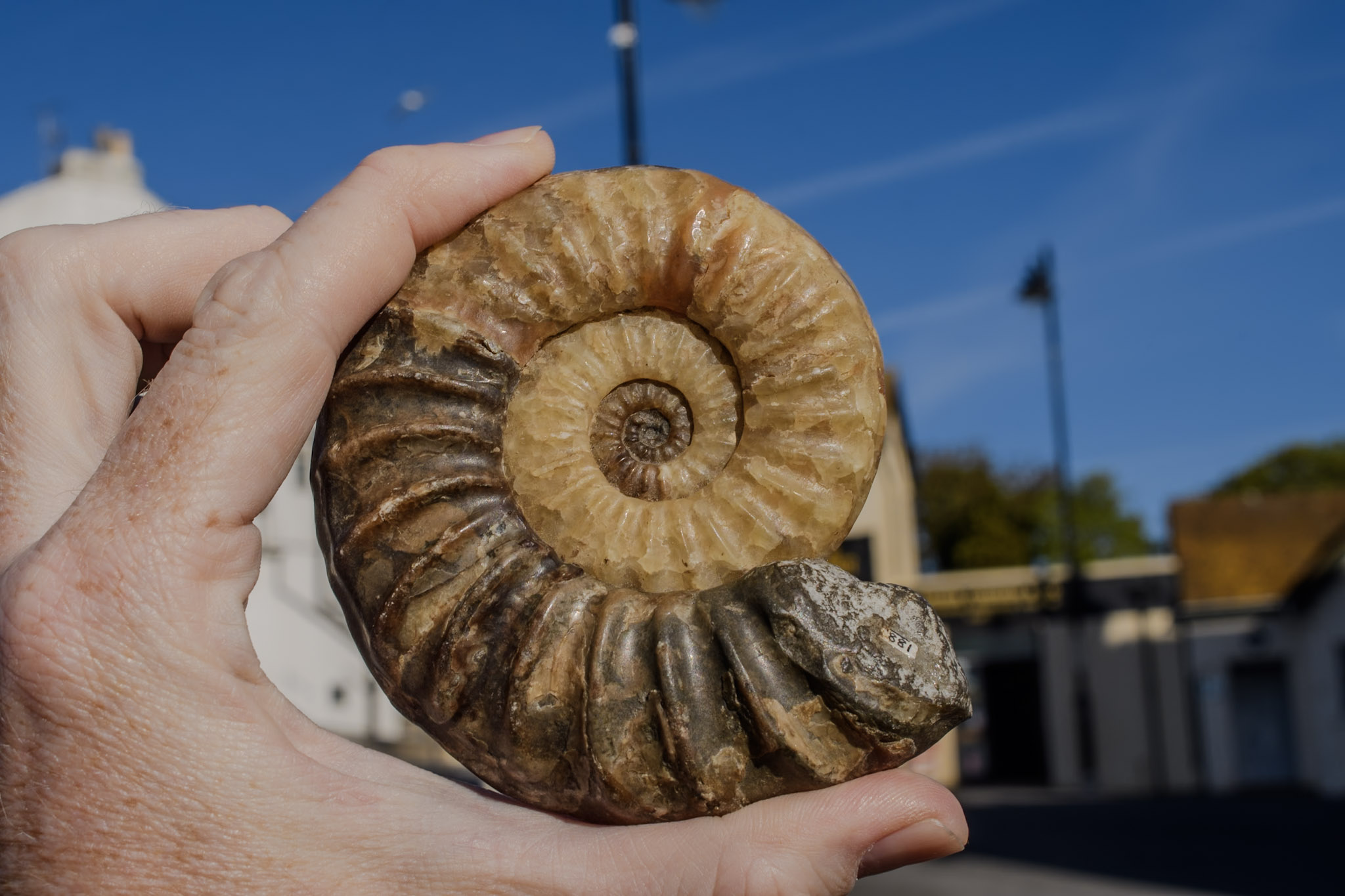 Above left: A beautiful example of a Asteroceras obtusum – unfortunately not an example that we found on our visit, but an example of the most sought after type of ammonite to be found in Lyme Regis which we were shown by our local guide!