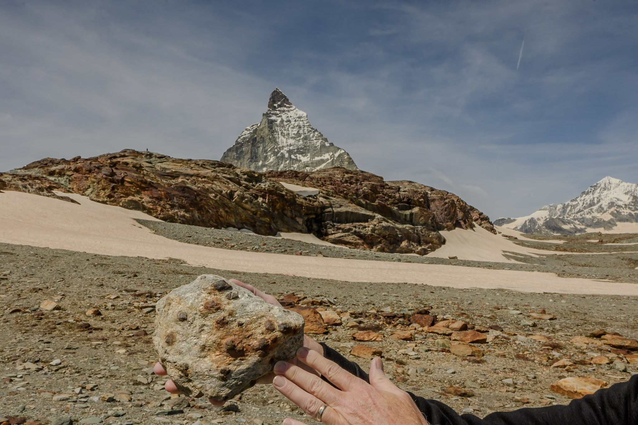 The rock being held in the foreground and the rock in the mid-ground are both part of the so-called Theodul Glacier Unit. This is a sliver of continental rock which lies within the ophiolite; its precise origins are still debated. The rock being held has been metamorphosed to eclogite facies and contains impressively large garnet crystals.
