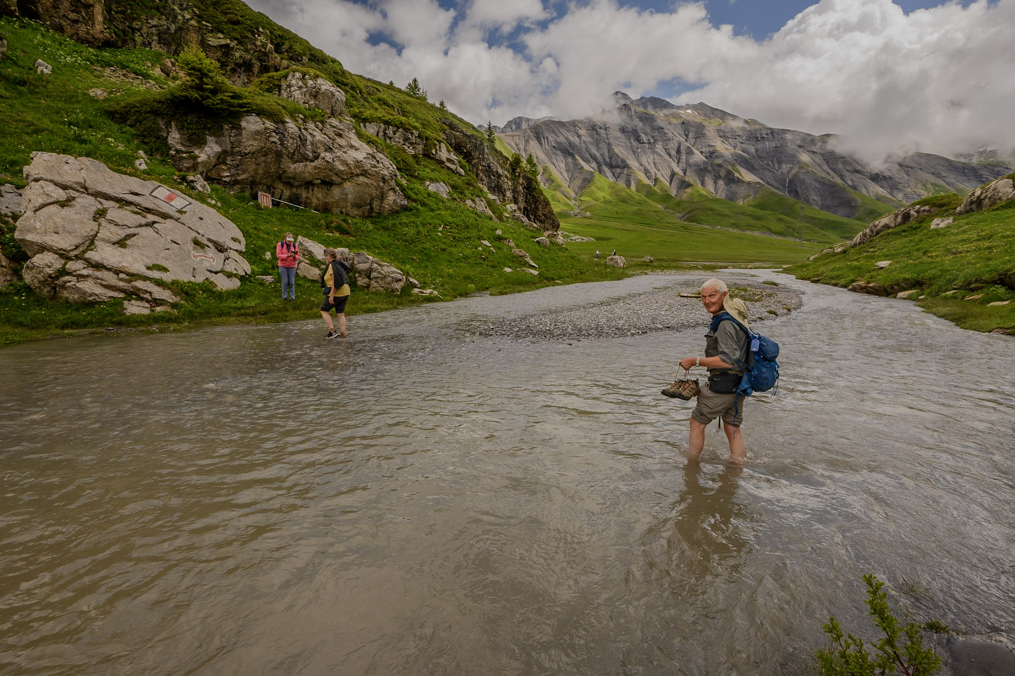 Above top right: Andrew wades through a stream at the Sanetsch Pass.