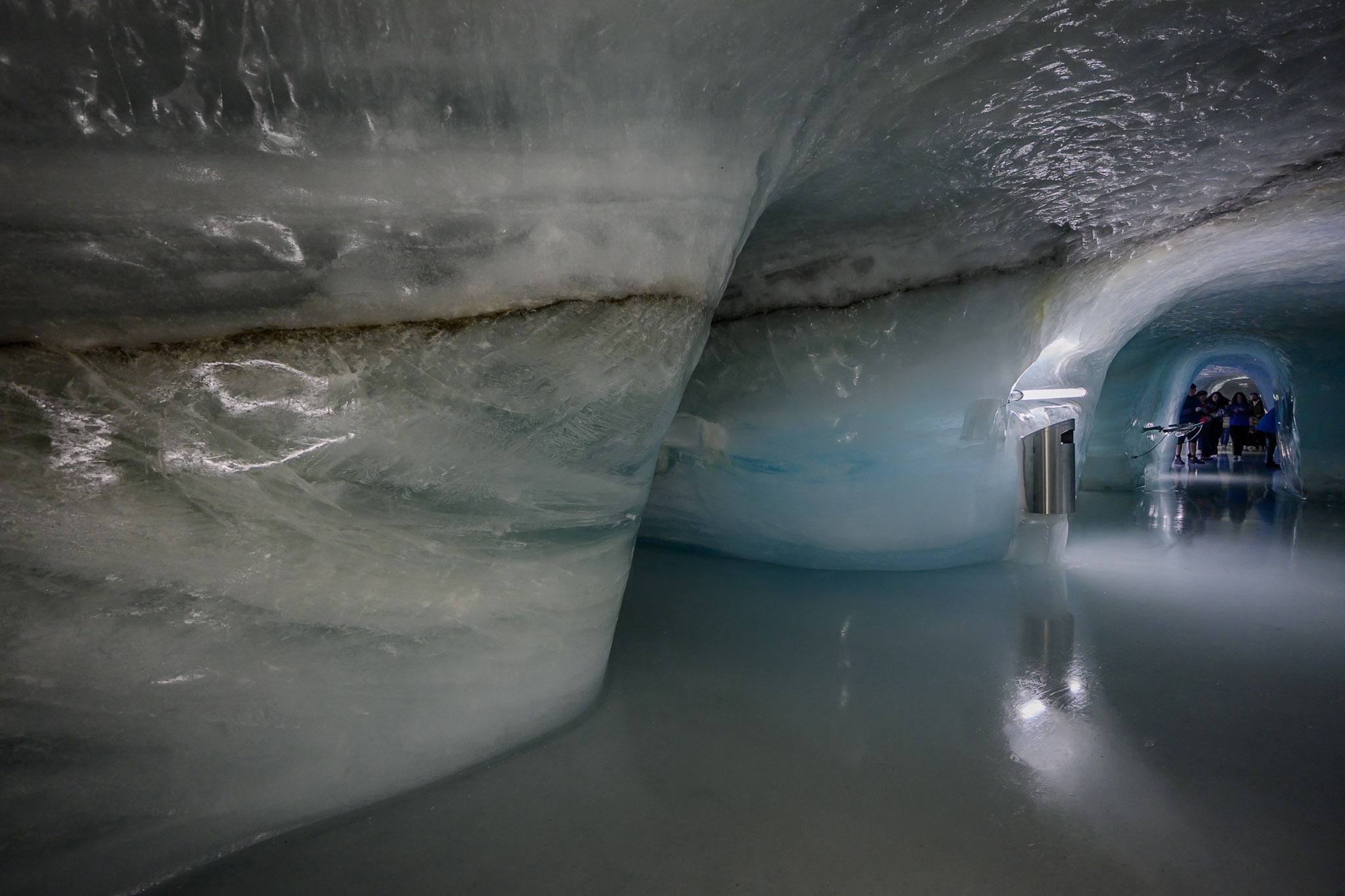 Photo taken inside the Ice Palace at the Jungfraujoch. The black line is a dirty, sediment-rich layer within the ice.