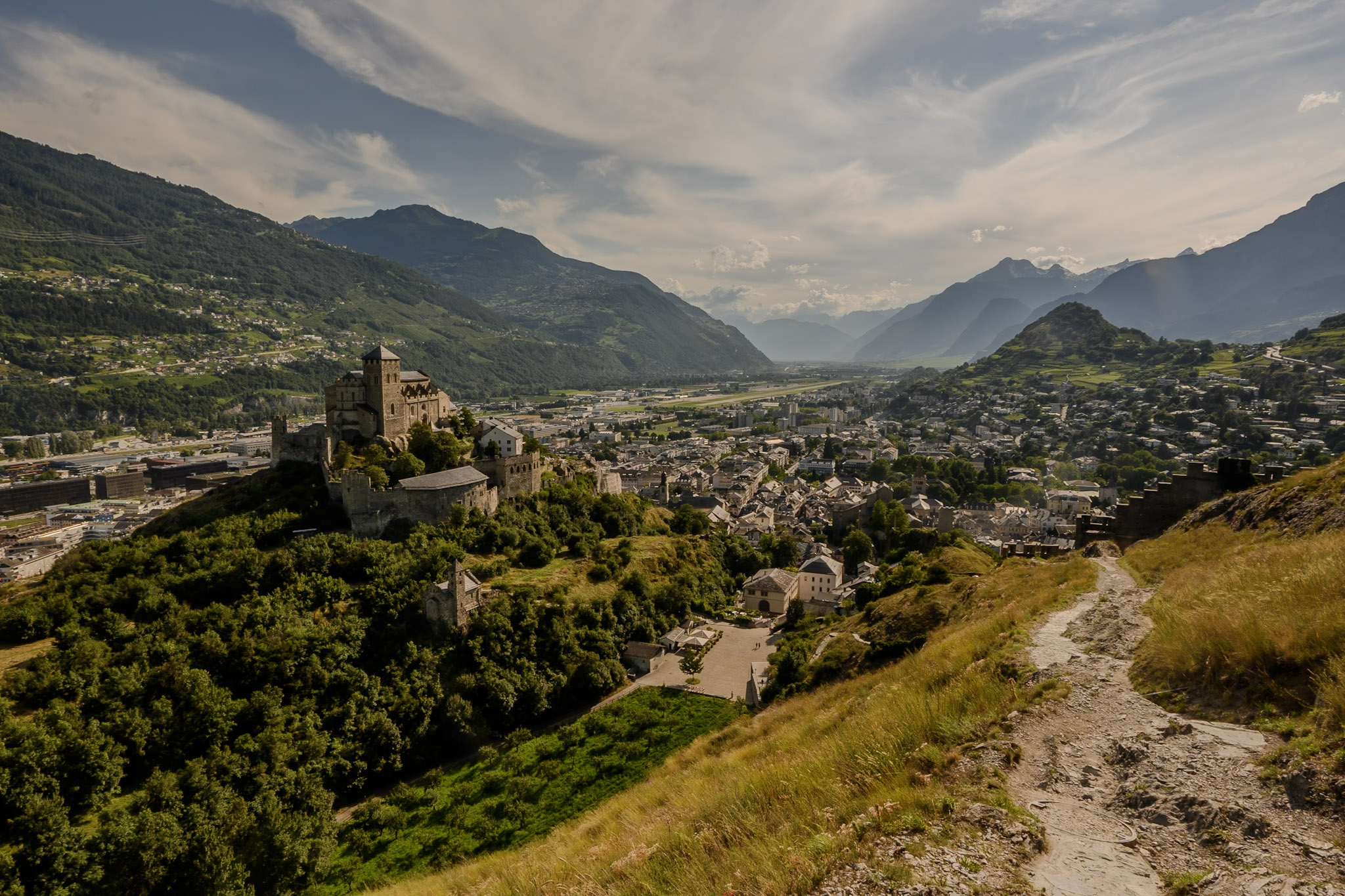 Above left: View over the town of Sion, with the Château de Tourbillon perched on a hill, left centre. The château was built between 1297-1308 and makes use of the natural terrain for its defences.