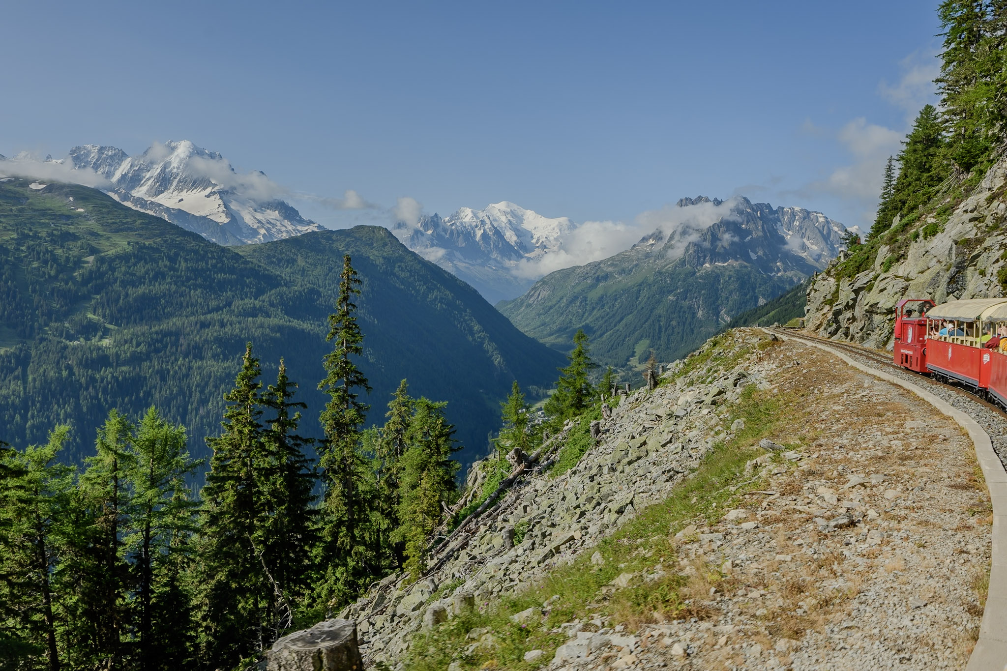 Clockwise from top left: Riding the scenic train up to the Emosson Dam with Mont Blanc in the distance.