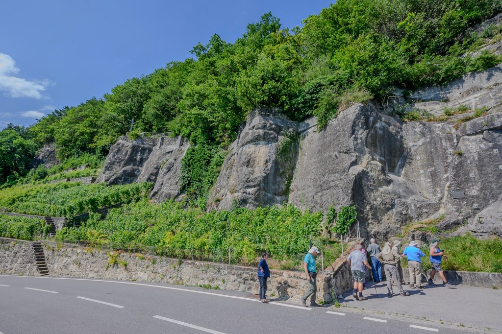 Bottom right: The GeoWorld Travel group observing 20-million-year-old conglomerate Molasse sediments in The Lavaux Vineyard Terraces UNESCO World Heritage Site.