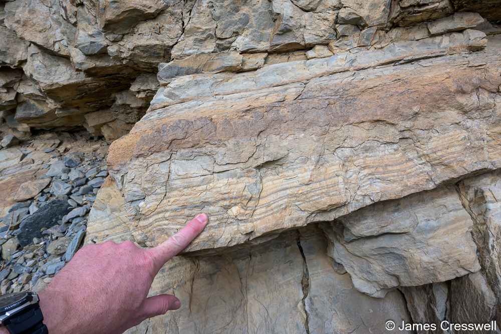Top right: A photograph of a drop stone (being pointed out) which fell from the base of floating ice and disturbed sediments beneath. This event happened in the Marinoan glaciation which was a Snowball Earth event that occurred around 640 million years ago.