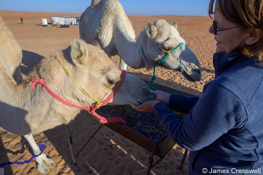 Bottom right: Mary Lou feeds camels at our Wahiba Sands campsite.