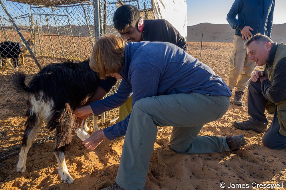 Top right: Mary Lou milking a goat at our Wahiba Sands campsite.