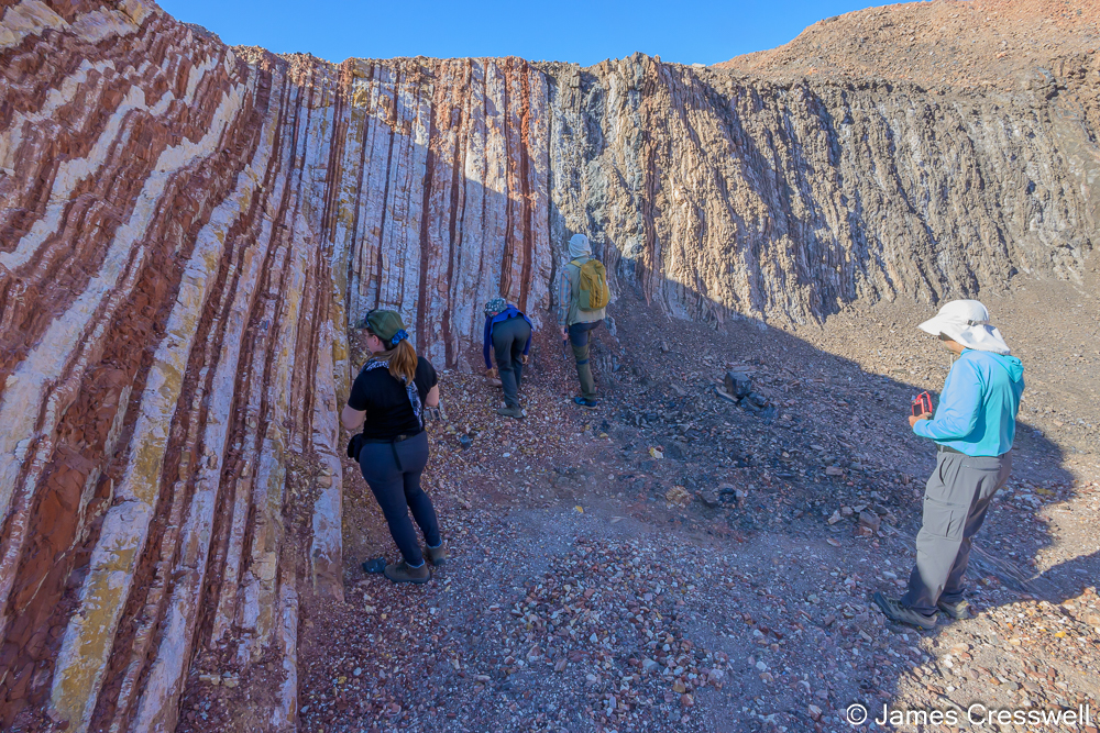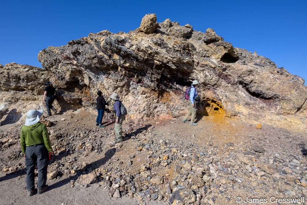Left: Members of the GeoWorld Travel group stand in front of a fossilised white smoker. A white smoker is like a black smoker but is formed by cooler temperatures (100°C rather than 300°C). Because these fluids are cooler, they precipitated fewer metal sulphides. Most of the deposits are opaline silicates.