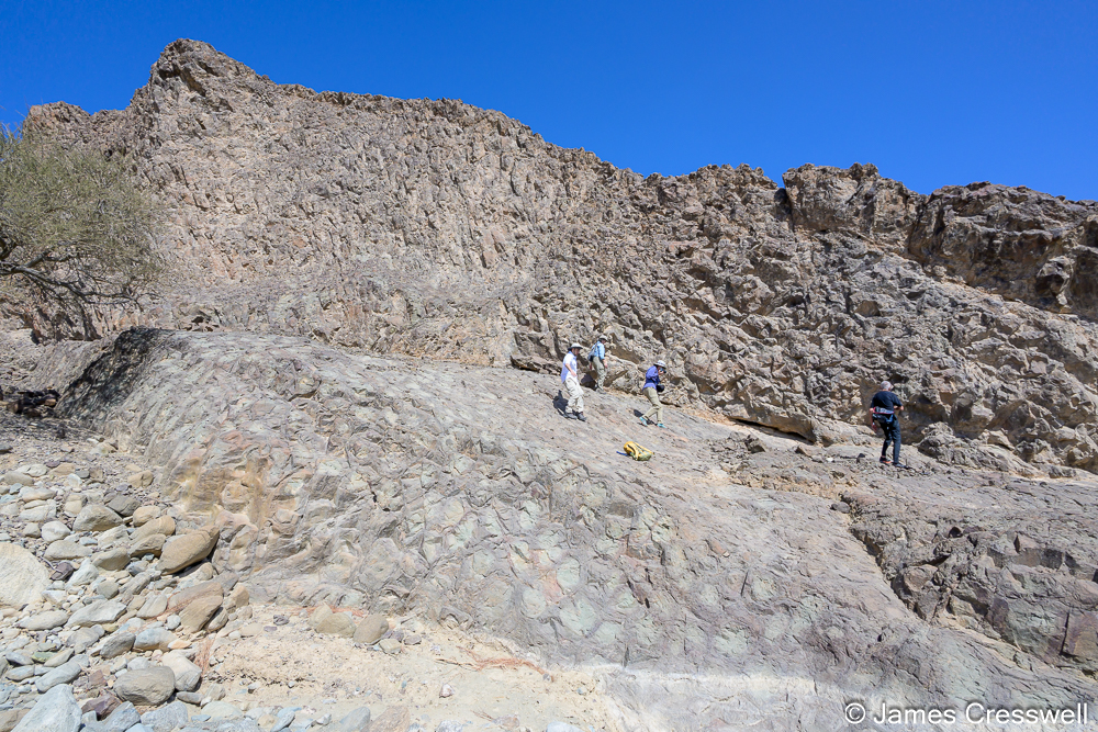 Right: In the foreground is an outcrop of pillow lavas that are made up of the rare type of lava, boninite. Boninites are andesites rich in magnesium and titanium that nearly always form only over subduction zones, giving important information as to how Oman’s ophiolite formed. The GeoWorld Travel group are examining further outcrops of boninite in the background.