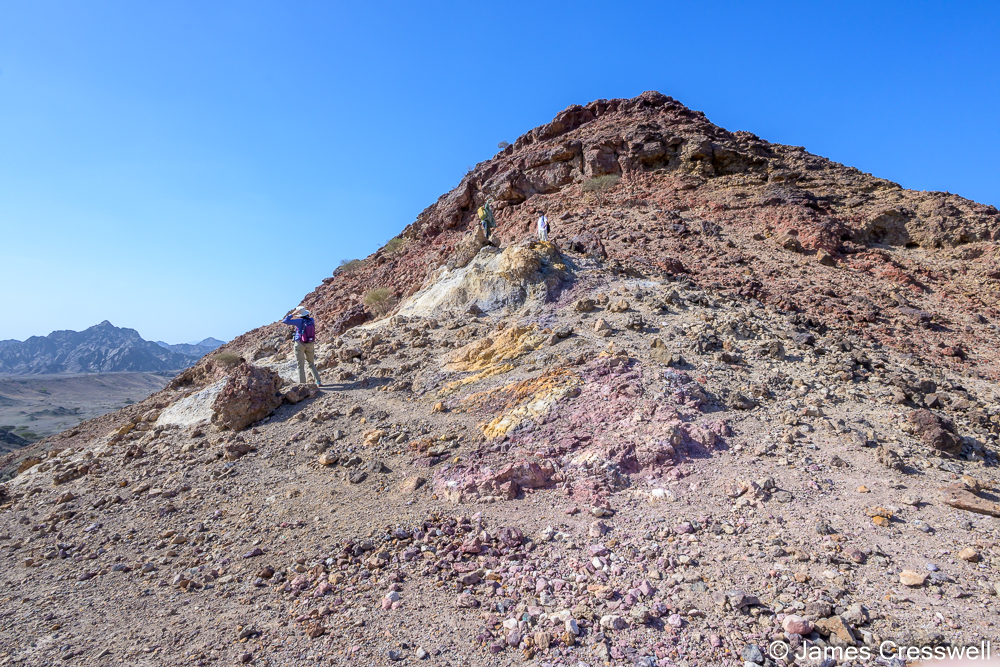 Left: The GeoWorld Travel group at the ‘mother of all outcrops’. Red radiolarian chert is interbedded with white porcellanite. Porcellanite is an impure chert containing clay and carbonates. The outcrop is folded and faulted. The folds are mostly reclined chevron folds, hinge collapse is frequently observed. Some posting folding normal faults cut the folds. There are also minor thrust faults that were formed during the folding. The outcrop is folded because it is part of the Batain nappe which obducted with the Masirah Ophiolite, some 15-20 million years after the Semail Ophiolite.