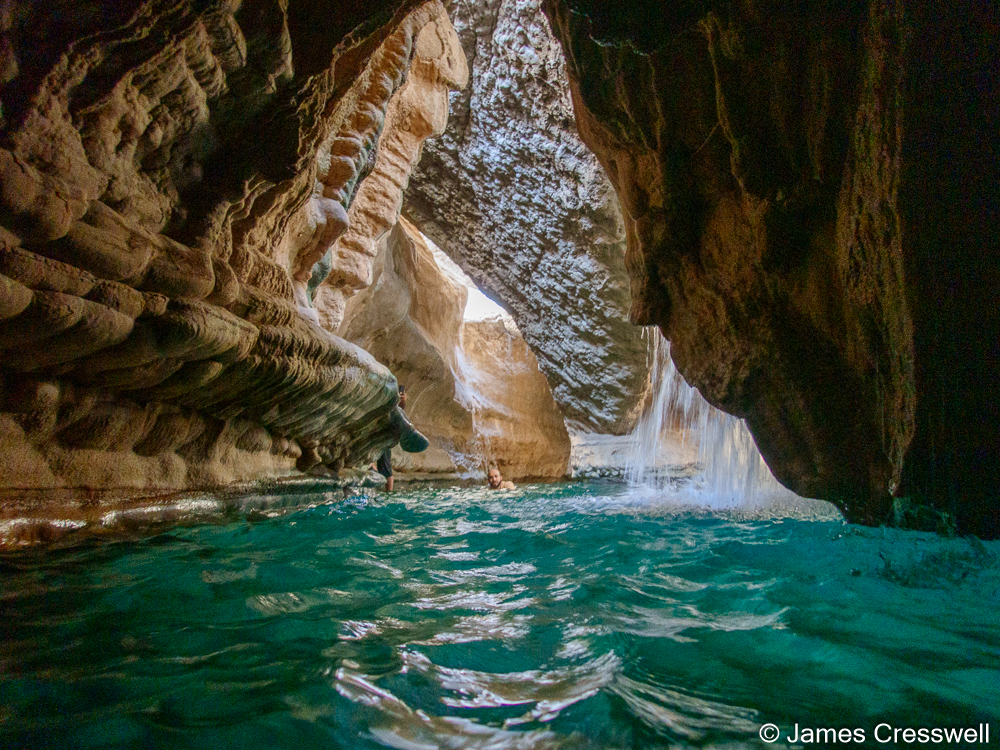 Top right: The slot which leads to the ‘secret cave’ at the end of Wadi Shab. To reach the cave one must swim across several pools and swim through this narrow opening.